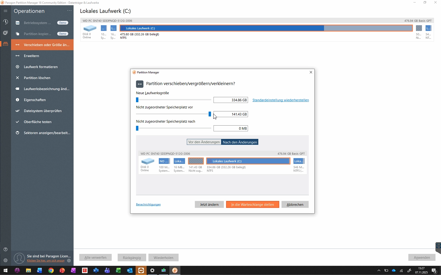 Der freie Speicherplatz muss links von der Partition platziert werden. Mit dem ersten Programm ist das nicht kostenlos machbar.