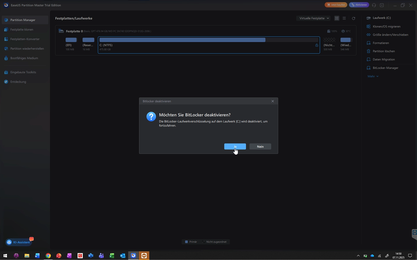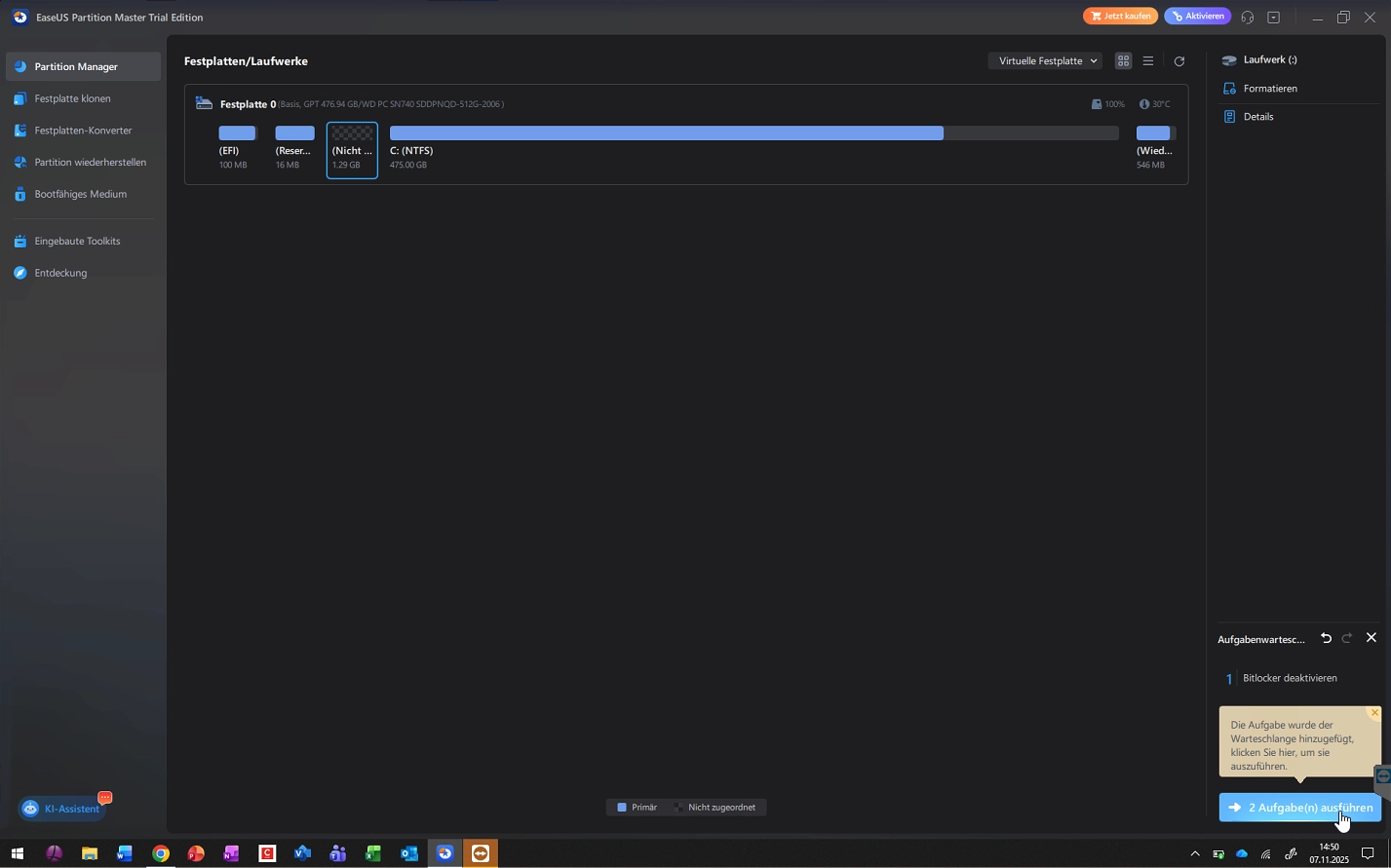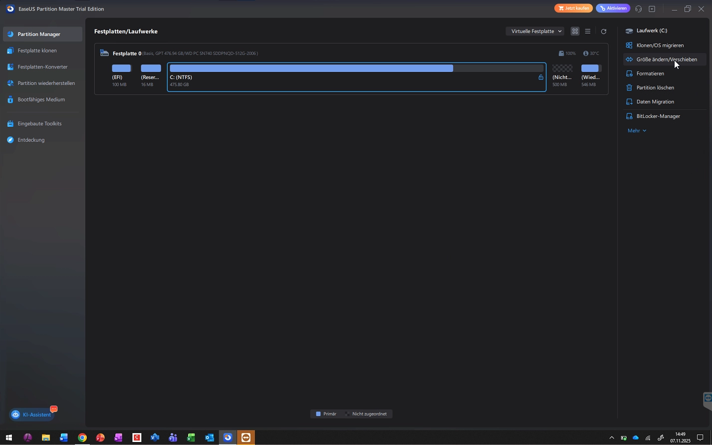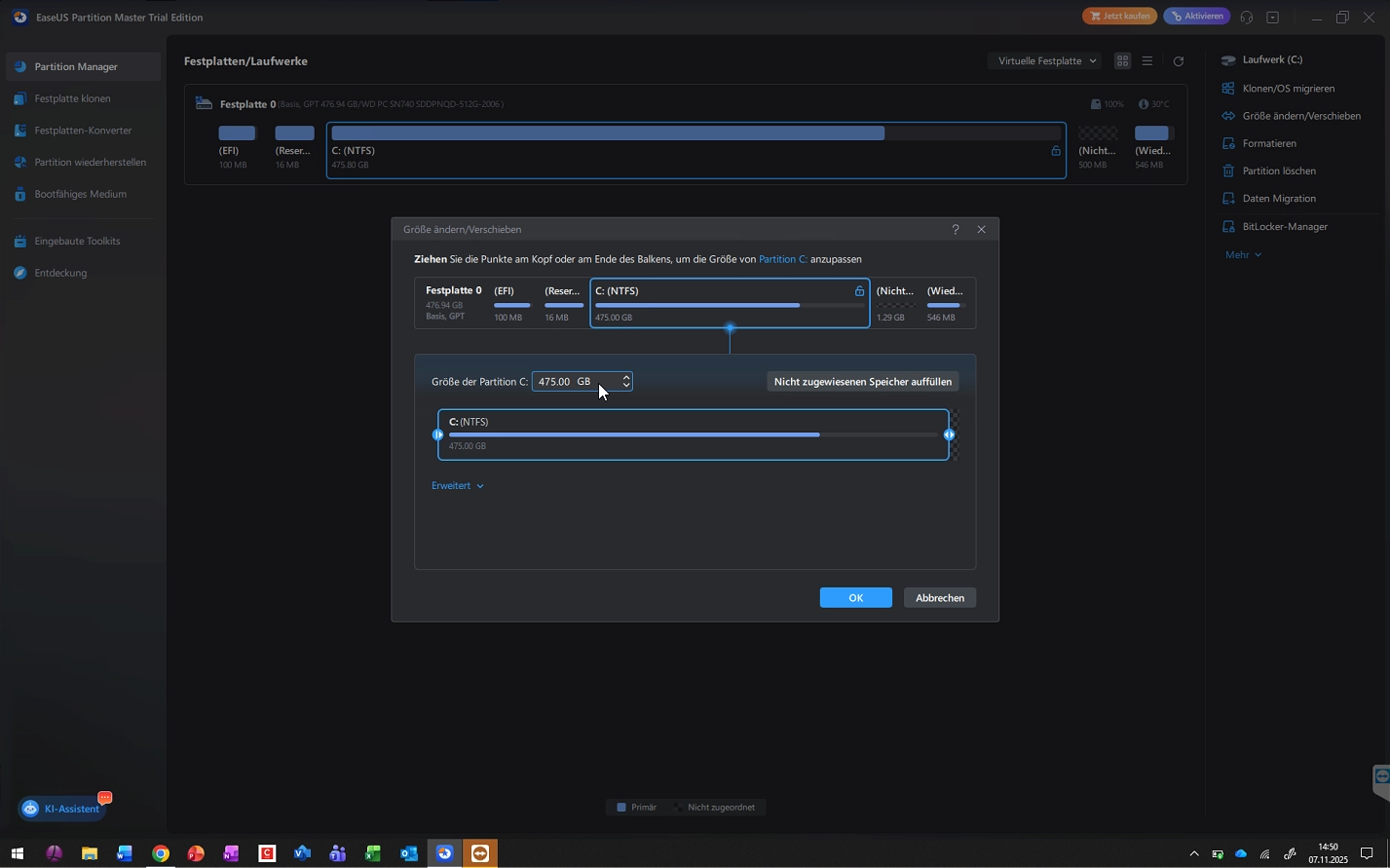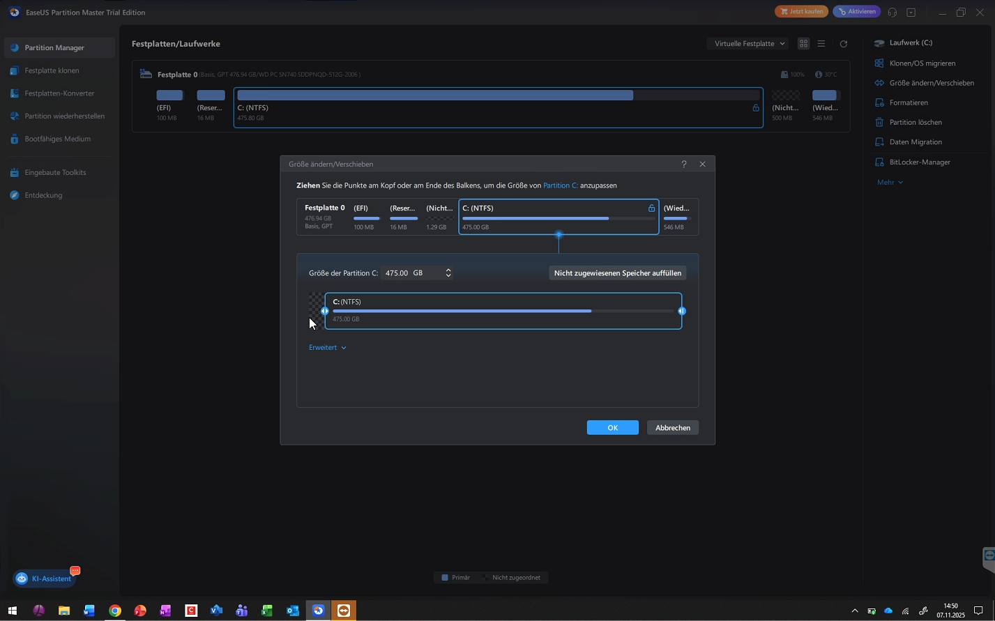 Evtl. Müssen sie die Partition "(Reserviert)" nach links verschieben. Dies können Sie im EaseUS machen. Grösse ändern und dann nach links verschieben.