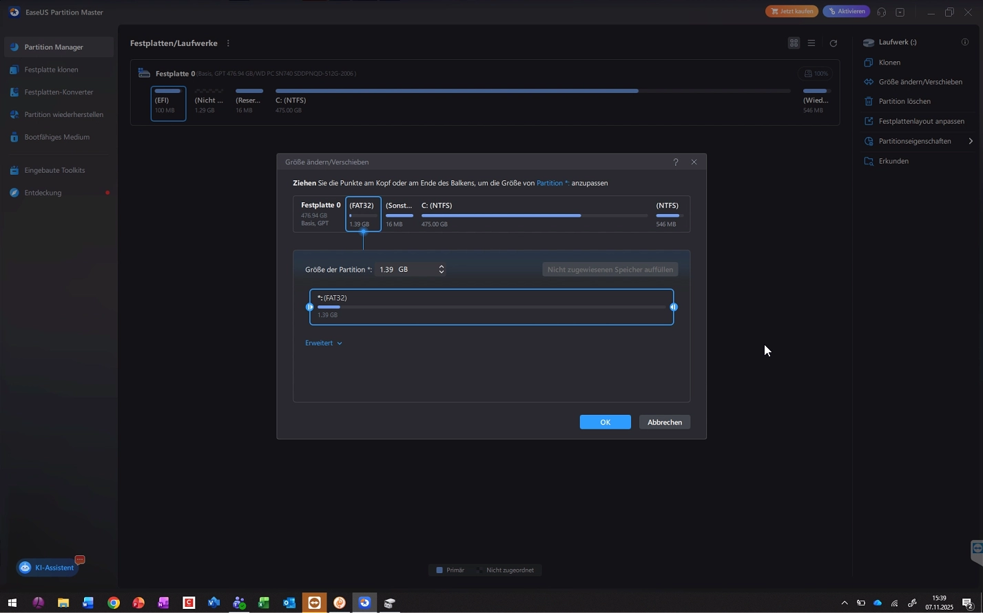 Nun können Sie die EFI Partition mit dem 1GB vergrössern. Es sollte so aussehen wie auf dem Bild.