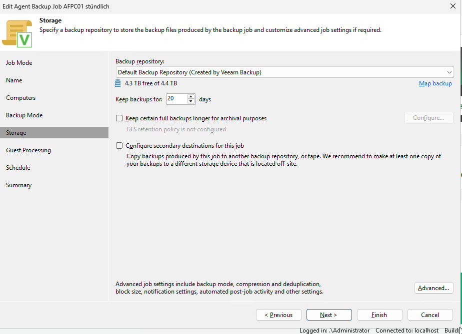 8. Beim Storage könne Sie den Speicherort wählen. Wird er nicht angezeigt, muss man ihn in der Backup Infrastructure hinzufügen.(z.B für ein NAS)