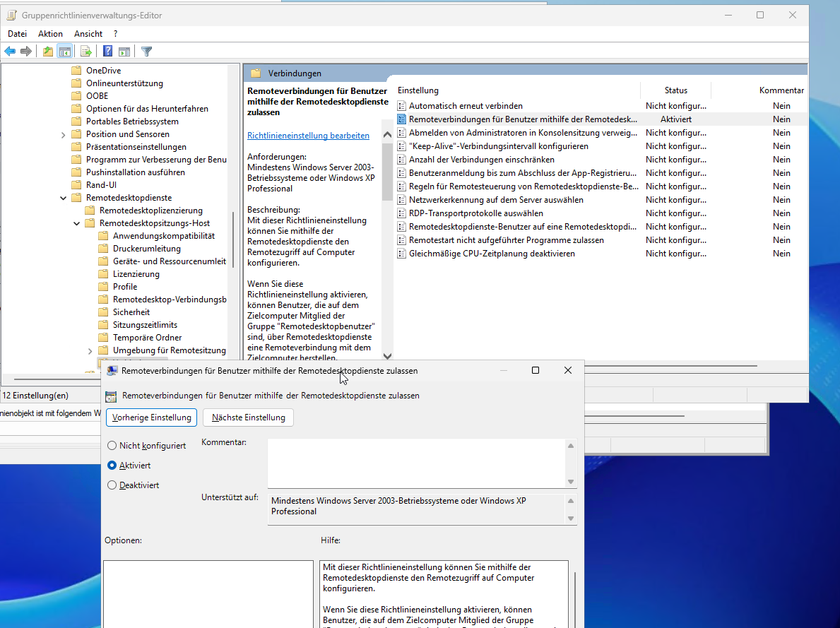 Computerkonfiguration → Richtlinien → Administrative Vorlagen → Windows-Komponenten → Remotedesktopdienste → Remotedesktopsitzungs-Host → Verbindungen