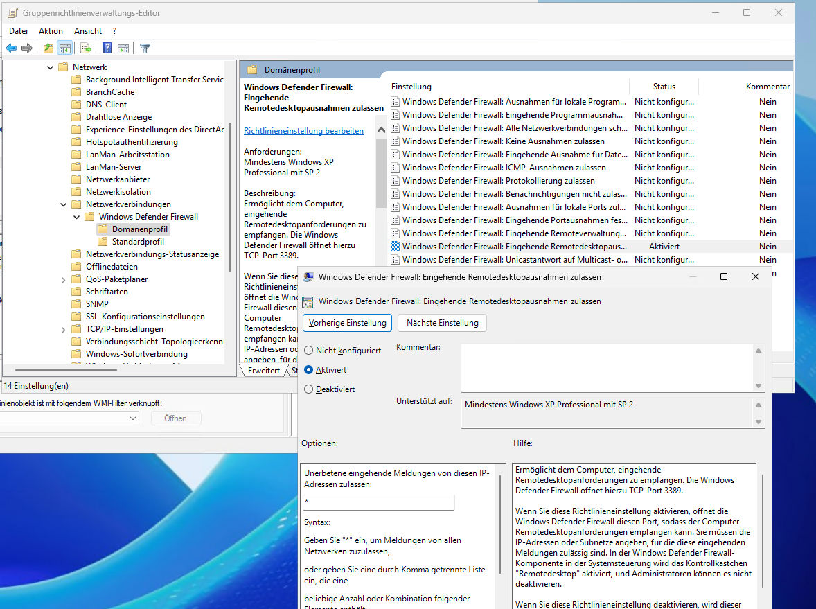 RDP via GPO auf Computern aktivieren.